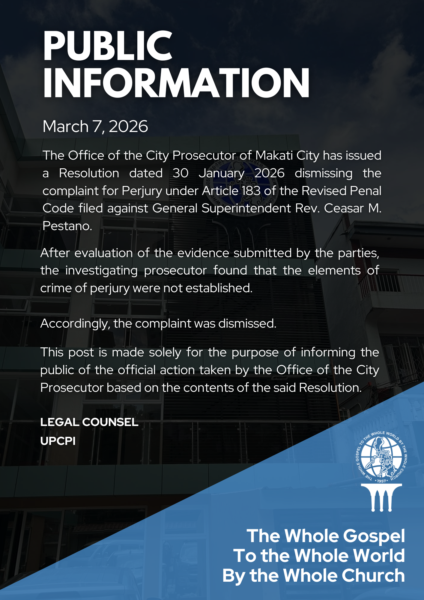 PUBLIC INFORMATION The Office of the City Prosecutor of Makati City has issued a Resolution dated 30 January 2026 dismissing the complaint for Perjury under Article 183 of the Revised Pena... Read More